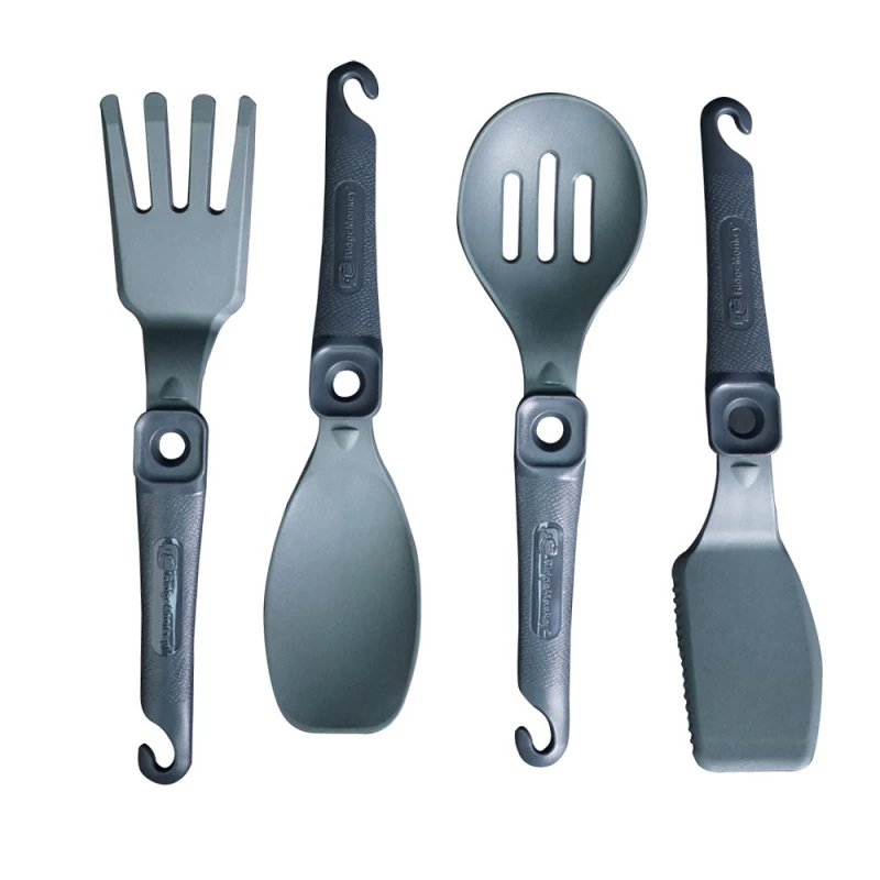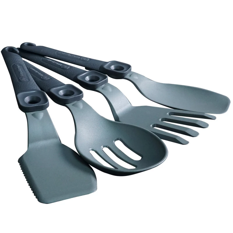Набор кухонных приборов «Q-Lock Utensil Set» от компании «Ridge Monkey» представляет собой прочный и износостойкий комплект, который состоит из лопатки-вилки, лопатки с зубчатым краем, ложки и шумовки. Все кухонные приборы поставляются в неопреновом чехле для удобства хранения.