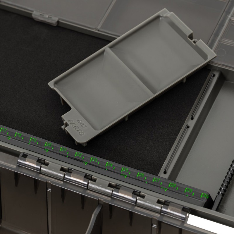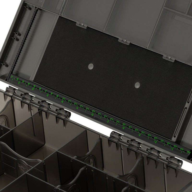 Тэклбокс оснащен линейкой высокой видимости, а также в комплекте идет небольшой съемный лоток, который позволяет временно разместить крошечные компоненты оснастки, такие как вертлюги, бусины и крючки, в легкодоступном месте, готовом к использованию, когда они вам понадобятся.