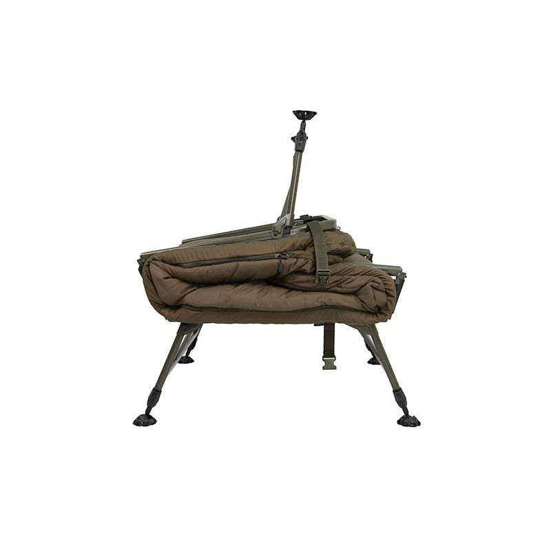 Спальная система состоит из раскладушки «Fox Flatliner X» с 6 ножками с пристегивающимся на молнию всесезонным спальным мешком «Fox Ventec»