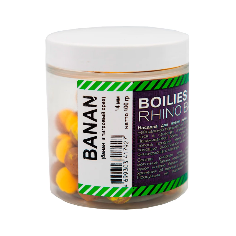 Бойлы нейтральной плавучести Rhino Baits Banana (банан и тигровый орех), 14 мм, банка 100 грамм.